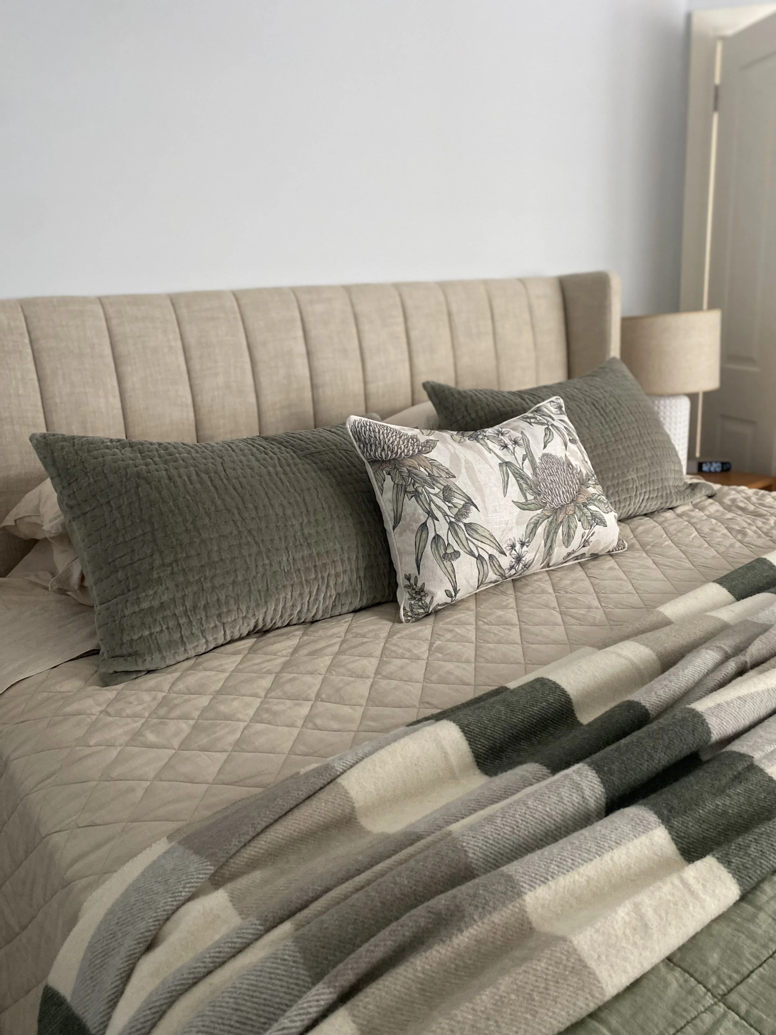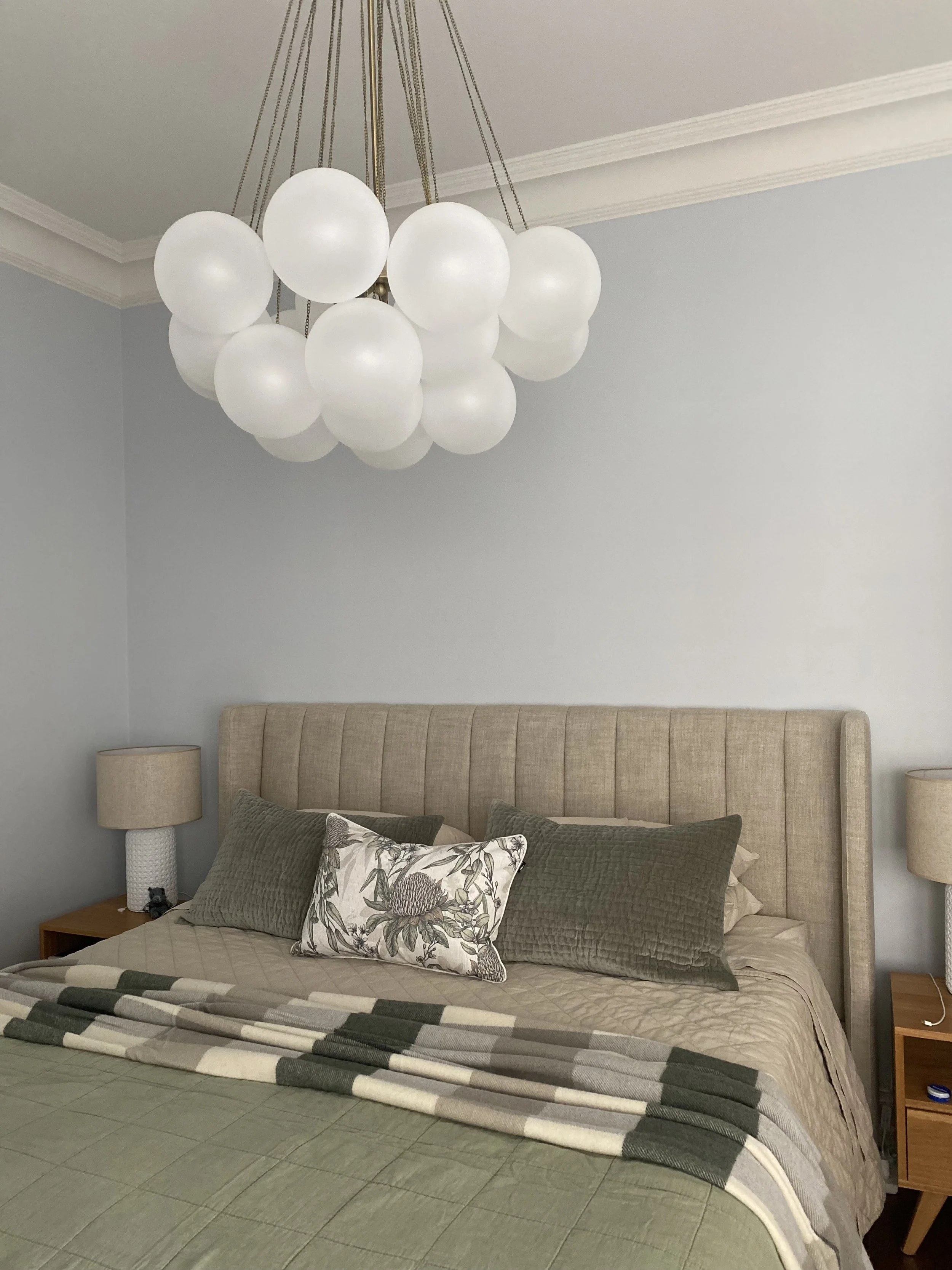 Our favourite transformation was the bedroom. The walls were painted a soft, calming blue, complemented by textural green linen and a statement pendant light. This creates a serene retreat that proves blue and green can beautifully work together.